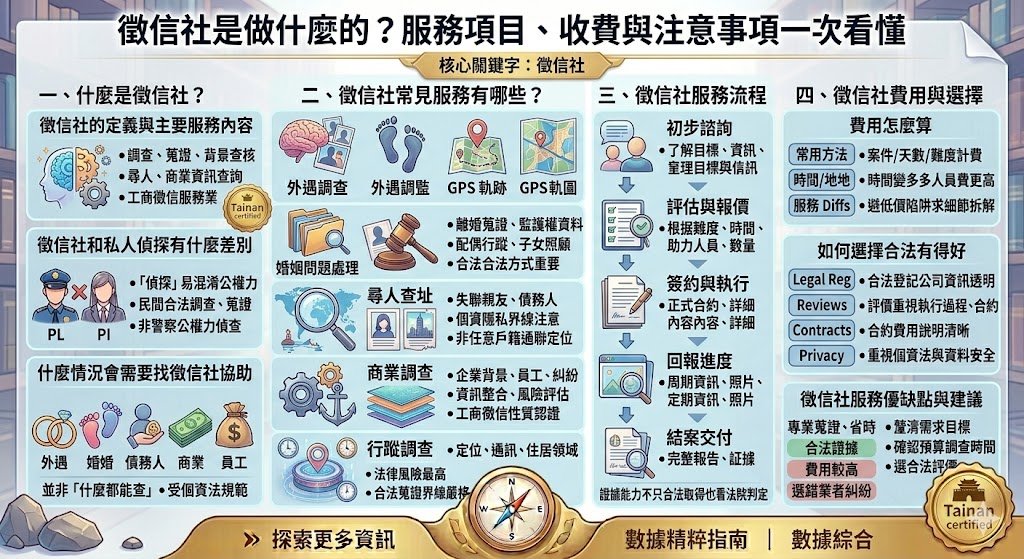 從台灣現行制度來看,相關業者可以合法存在並經營工商徵信服務,但蒐集、處理與利用個資仍受法律規範,能否作為法院證據也要看取得方式是否合法。真正重要的,不只是找到會查的人,而是找到合法、透明、懂風險界線的業者,這樣才比較能在保護自己權益的前提下,完成委託。