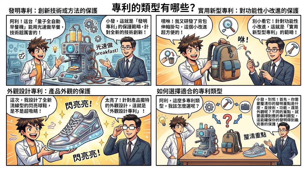 專利是國家授予發明人或創作者的專有權利,使其能夠在一定時間內控制技術、產品或設計的使用。專利有以下三種類型:
