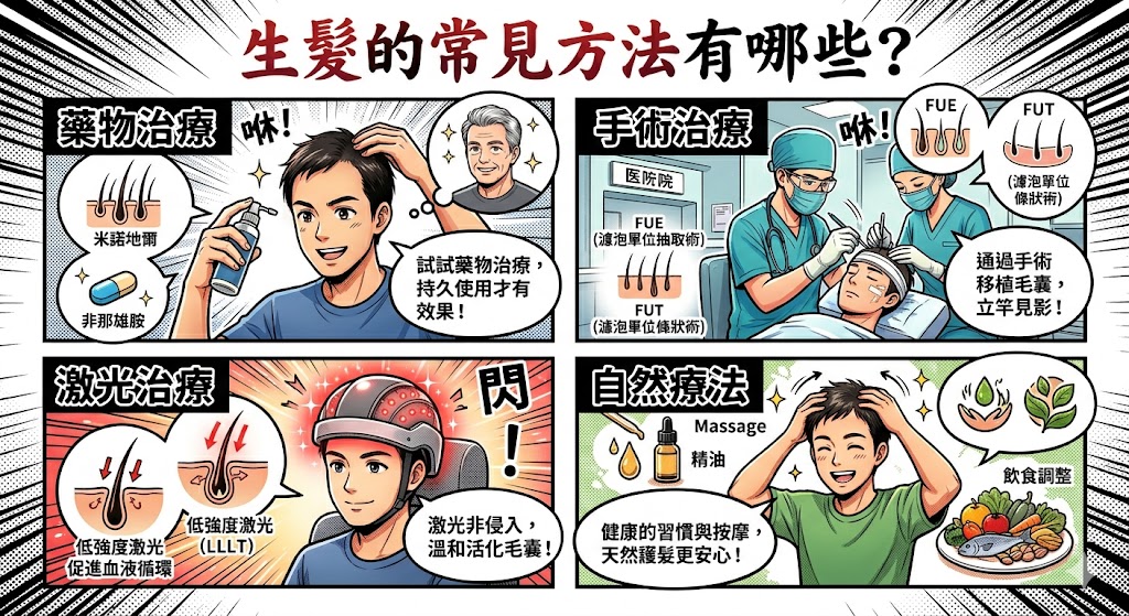 A:生髮方法主要包括藥物治療(如米諾地爾和非那雄胺)、植髮手術(如FUE與FUT)、激光治療與自然療法(如頭皮按摩與飲食調整)等。